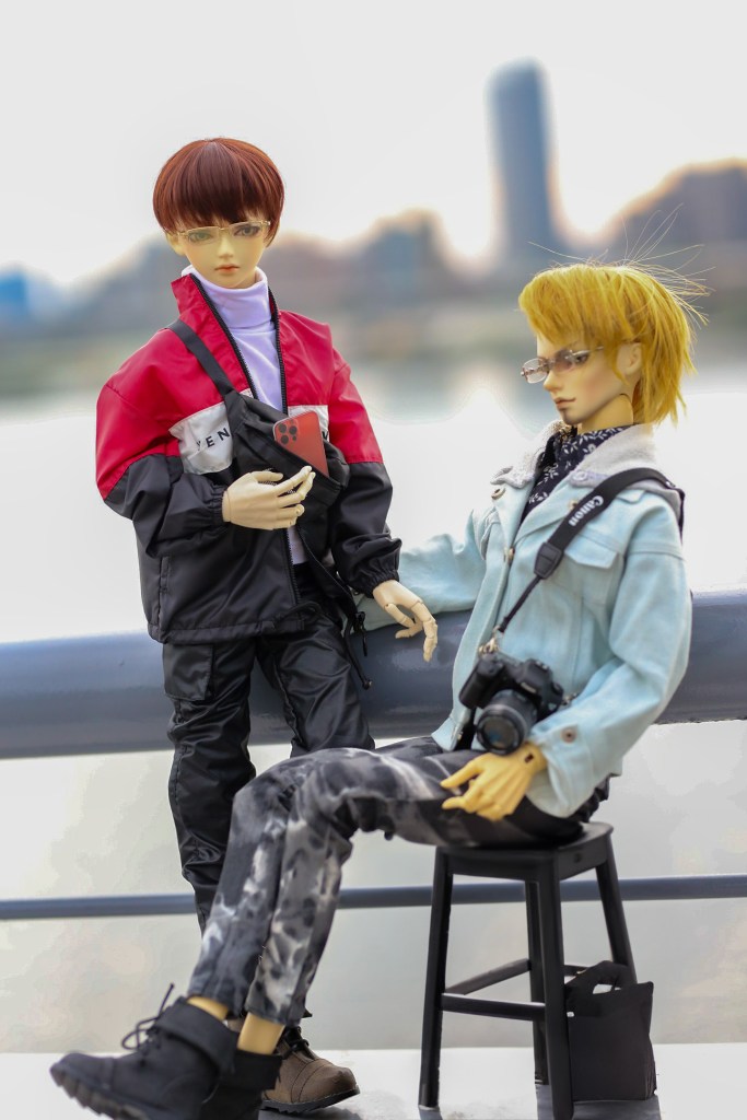 這次是愛瑞克,為了讓他拿相機,方便控制方向所以我把他外套脫掉,但是手臂的形狀就是很BJD,所以就靠AI挽回看看
