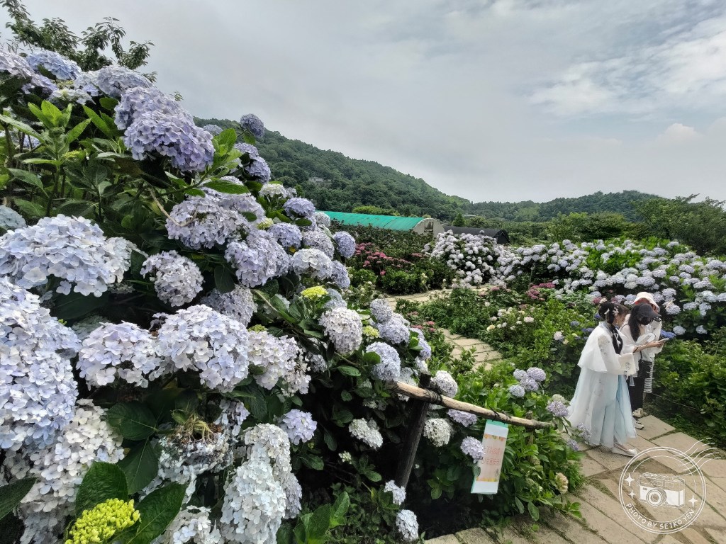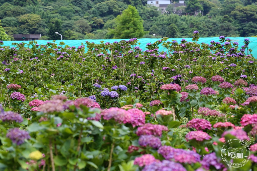 我自己有去過陽明山上其他繡球花園不分大小腹地深廣,大部分都是泥土底,雖然有各種造景,但是泥土底第一是下雨天會很難拍,另外就是對腳架不太友善,腳架也不好釘,要另外拔腳架腳(?),看到地磚之後我想的確是可以來一下了!