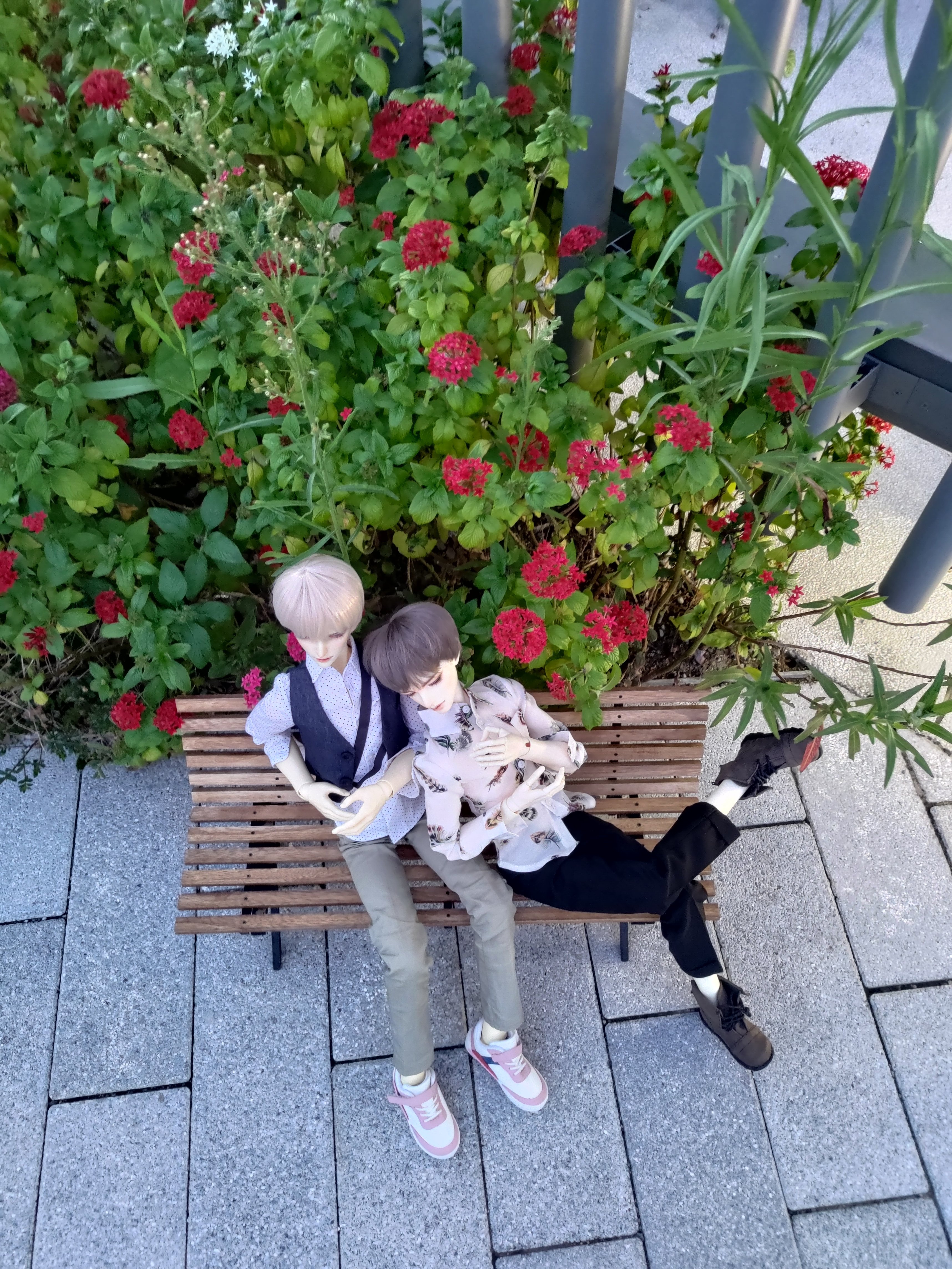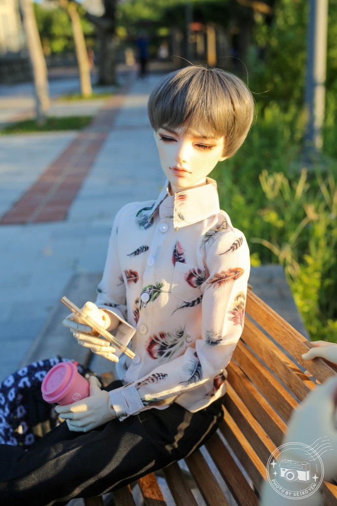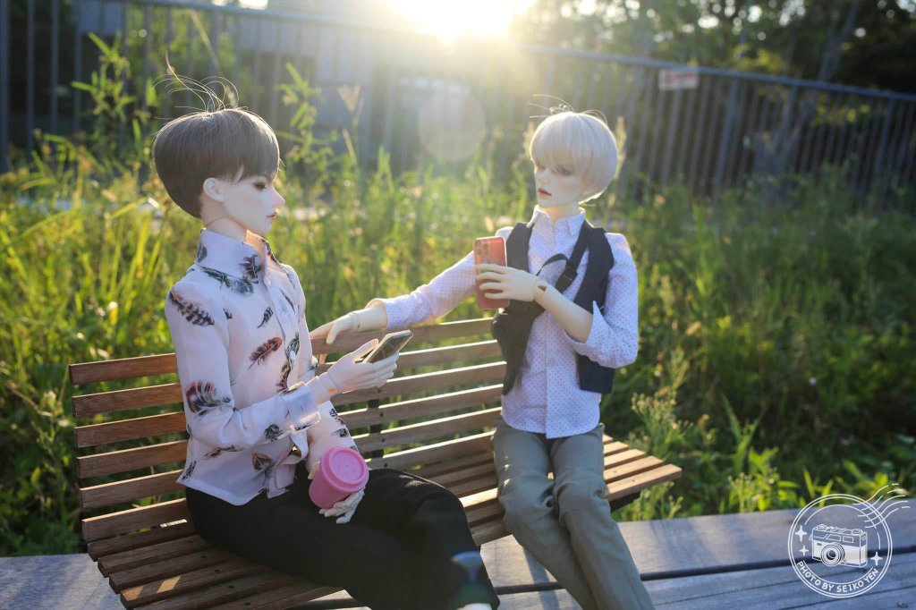 如果要架露營椅,可能我也要帶一塊露營墊、一大兩小的娃,他們放在露營桌上的道具等,想了又想,最後出門前問了噗神,叫我帶大娃不要帶小娃,如果這樣也就不用特別帶露營椅,想到目前只拍了一次的公園椅,排除幾個出門要換衣服的剛換西裝的研磨、盛裝打扮的愛倫、沒穿衣服的威克,成人組目前能動用的應該是卓也、十眠跟亞蘭。又問了噗神的意見,決定帶十眠跟卓也出門。