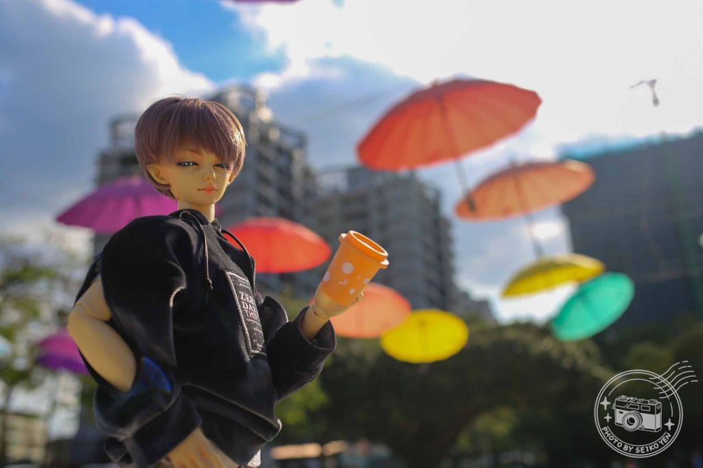 在園裡走了一圈,發現有一面黑彩繪牆可以不用腳架也能坐著
